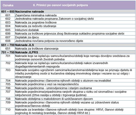 • U Prilogu 1. dodana je nova oznaka 15 za isplatitelje socijalnih potpora, koji će o isplaćenim neoporezivim primicima po osnovi socijalnih potpora izvještavati pod oznakama iz novo propisanog priloga 6. Obrasca JOPPD, a pregled je u tablici u nastavku: