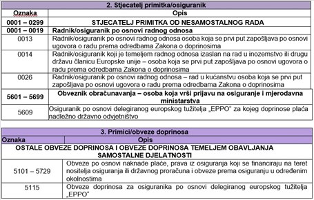Nadalje, zbog novo propisanog oblika oslobođenja od plaćanja doprinosa za zdravstveno osiguranje te novog načina obračuna i zaduživanja doprinosa za delegirane europske tužitelje sukladno Zakonu o doprinosima, u Prilozima 2. i 3. dodane su nove oznake, a koje donosimo u nastavku:
